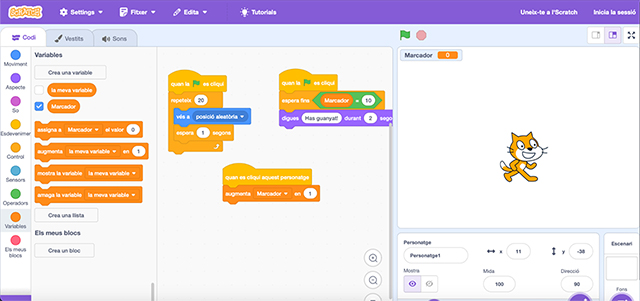 - Establir una condició perquè el programa estigui pendent de quan el marcador arribi a deu punts. En aquest moment, el personatge ha de dir «Has guanyat!».