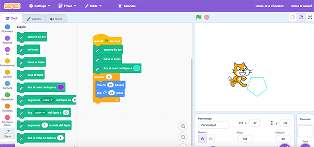 A l’hora de programar, l’abstracció permet centrar-se en el nucli del programa. Permet identificar els blocs de codi a partir del qual es crearà el programa sencer. En la figura 3 es mostra un programa per dibuixar un pentàgon regular d’un color i una mida determinats. A partir d’aquest exemple es demana a l’alumnat que creï un programa per dibuixar un hexàgon.